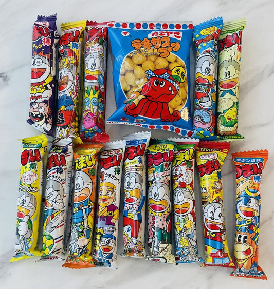 Japanese popular snack UMAIBO 14 all different flavors.and Takoyaki snack